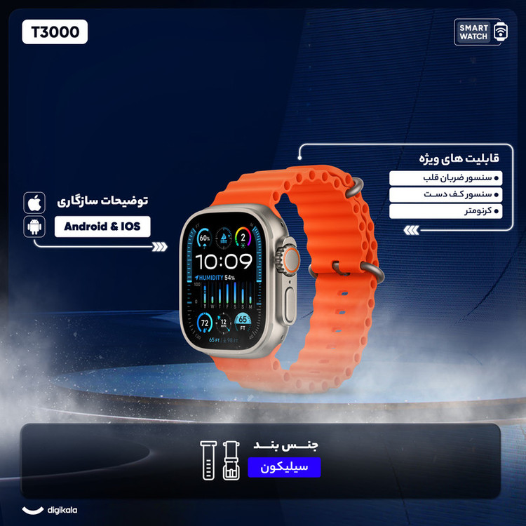 ساعت T3000 با بالاترین کیفیت درمیان ساعت های هم رده ی خود در این بازه قیمتی میباشد . از ویژگی های این ساعت میتوان به : سازگار بودن اندروید و ios ، شارژر وایرلس ، سنسور ضربان قلب ، سنسور کف دست ، ماشین حساب کرنومتر ، بازی ، میباشد . همچنین با وصل شدن به برنامه جانبی آن Fit pro میتوان از قابلیت های بیشتری بهره مند شد .