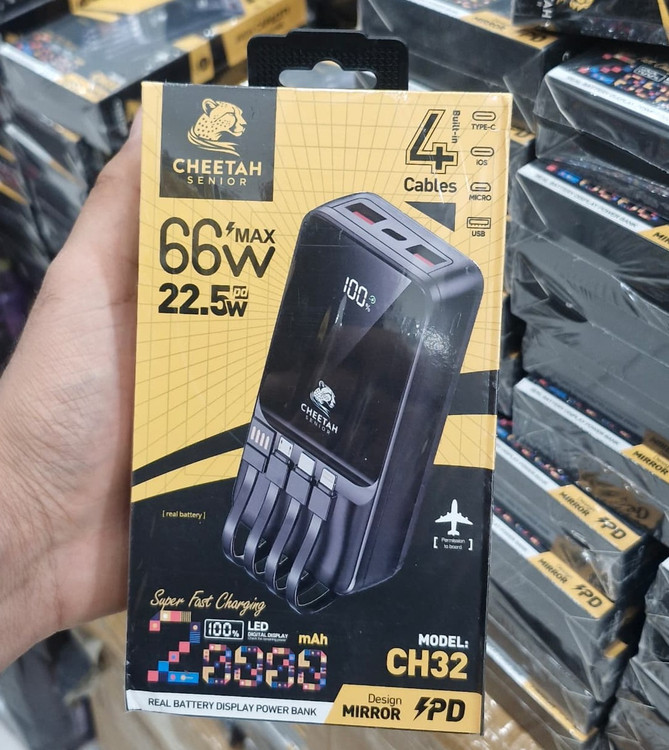 پاوربانک 66 وات چیتا مدل CH32 یک گزینهی فوقالعاده برای افرادی است که میخواهند همزمان چند دستگاه را با سرعت بالا شارژ کنند. این محصول با ترکیب سه قابلیت جذاب شامل پاوربانک، شارژر دیواری و چهار کابل داخلی، نیاز شما به حمل چندین وسیله مختلف را کاملاً برطرف میکند.